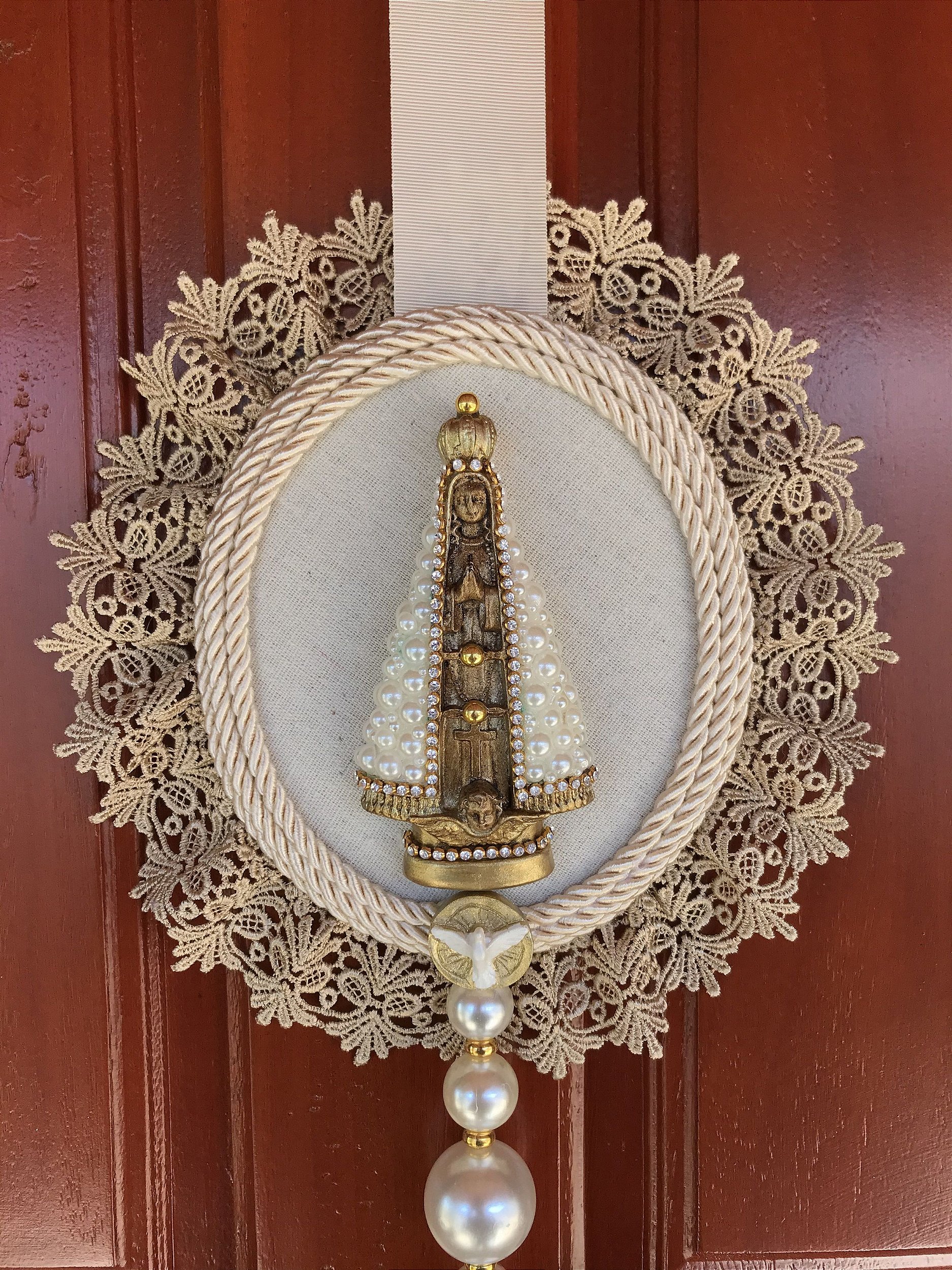 Escapulário de porta de Nossa Senhora Aparecida com 25cm, renda Guipir, pingente de pérolas brancas e franja.